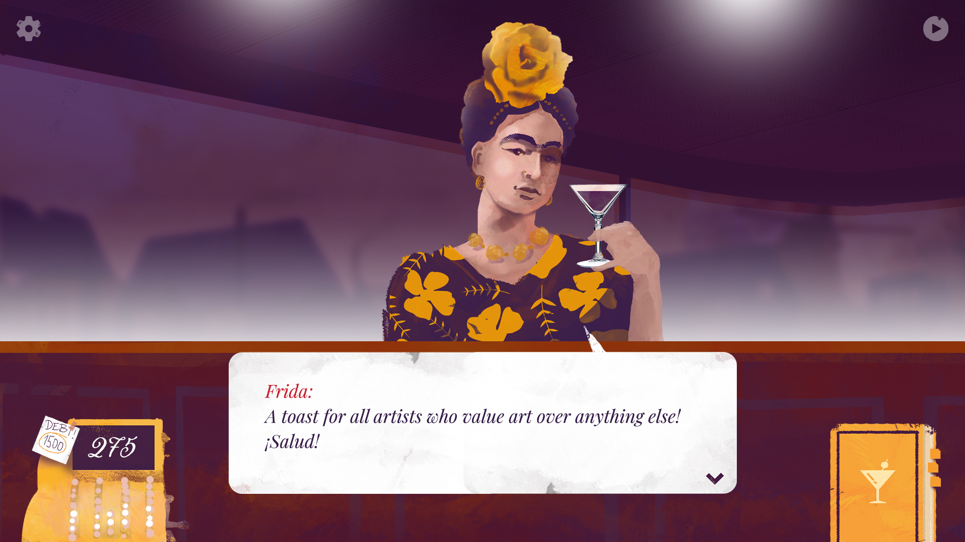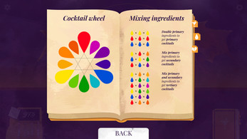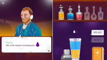 Step behind the bar and mix cocktails that match moods, not menus. Blue for sorrow, red for passion, magenta for meltdown—because in this bar, color theory saves souls.